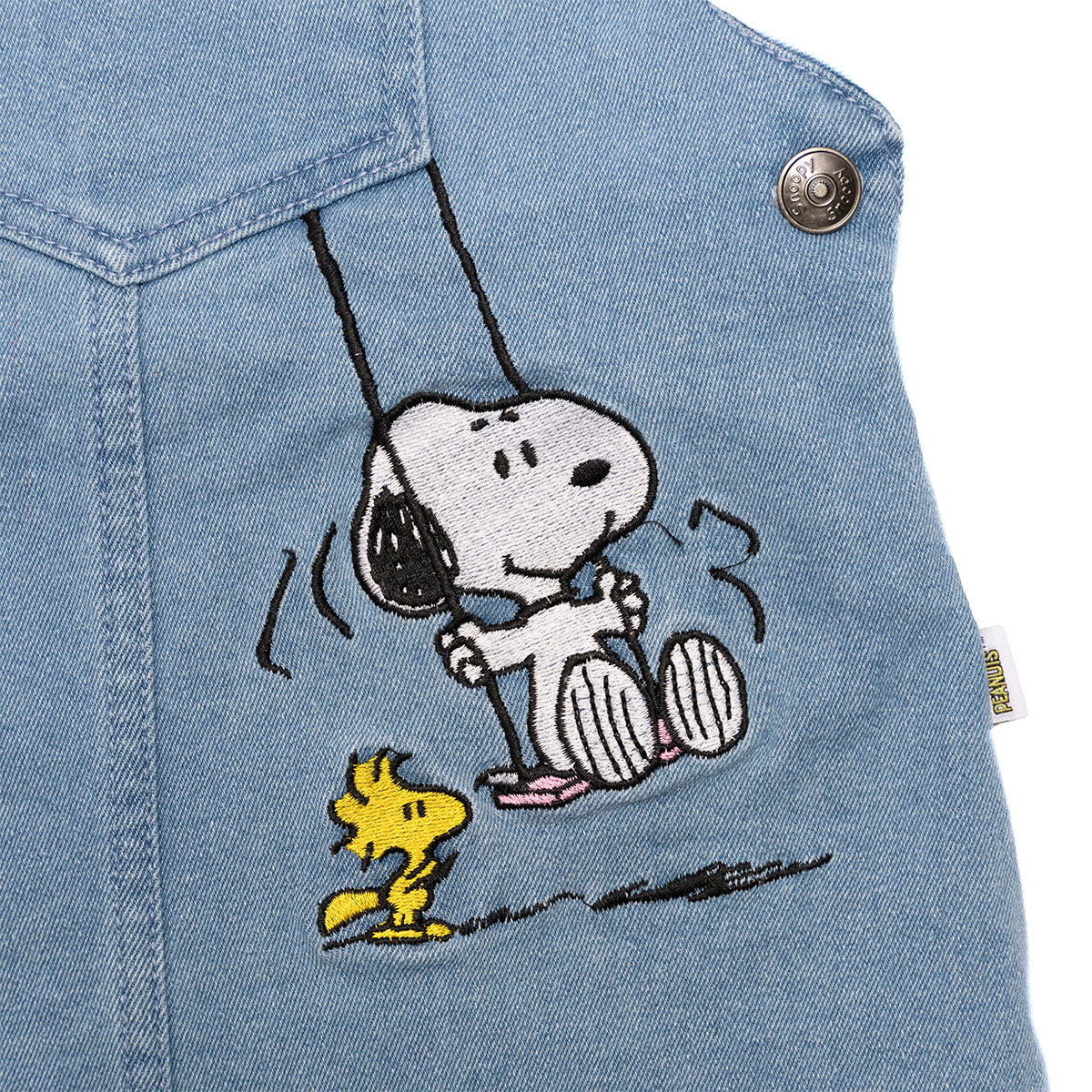 Jumper de mezclilla azul claro con tirantes ajustables, bolsillo frontal y bordado decorativo de Snoopy y Woodstock