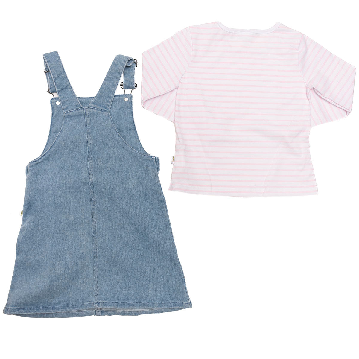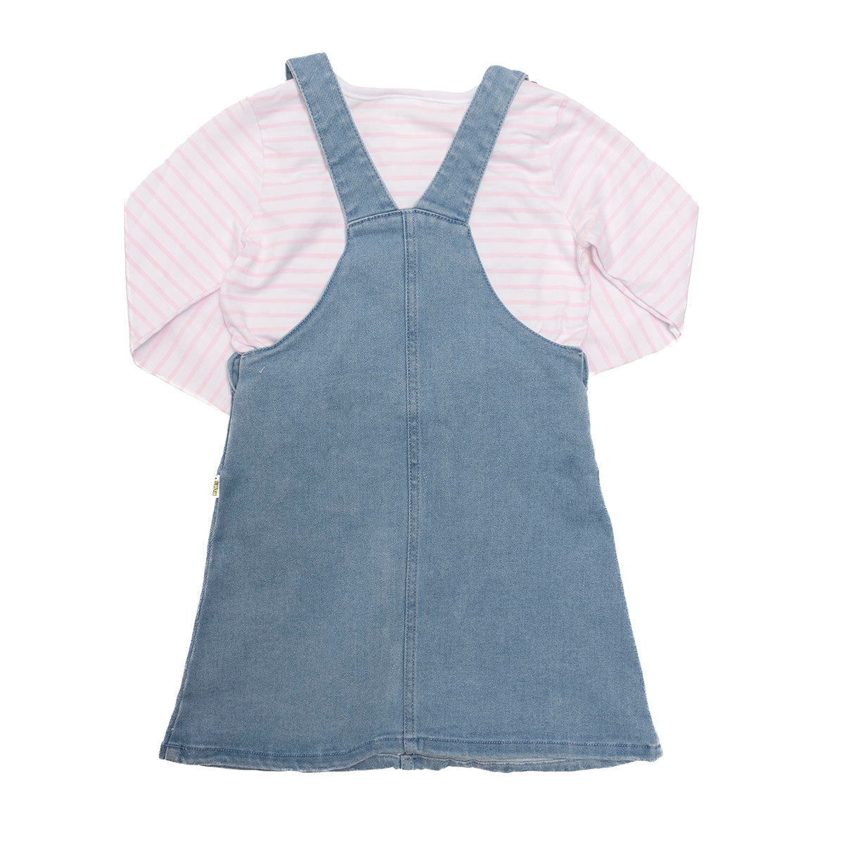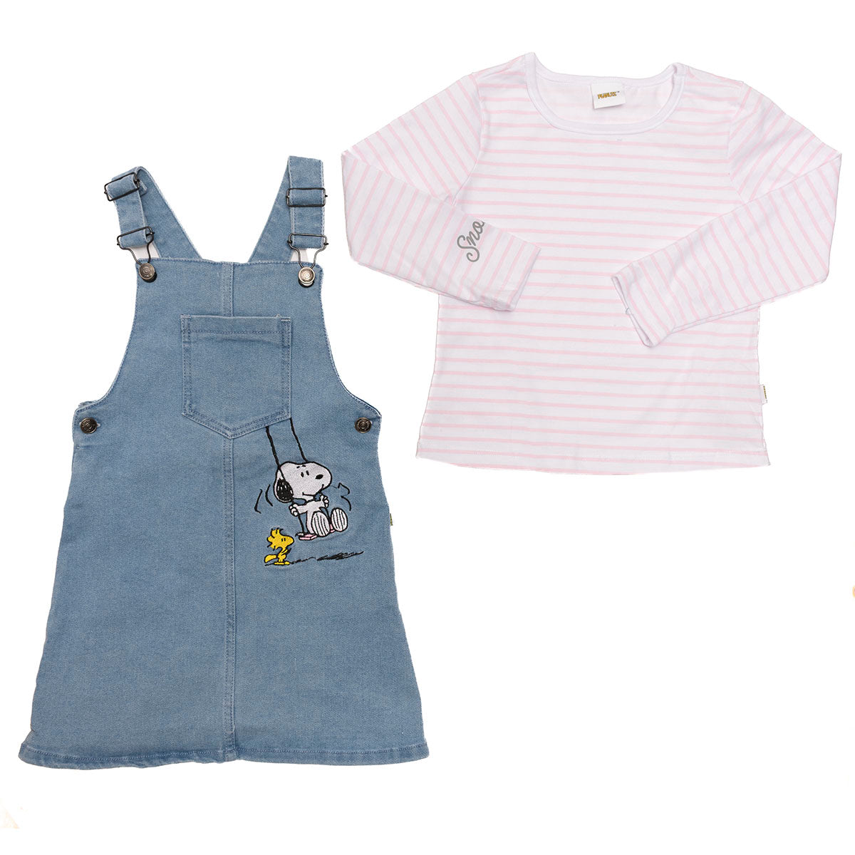 Un conjunto encantador y versátil para las pequeñas fans de Snoopy. Incluye un jumper de mezclilla azul claro con tirantes ajustables y un bordado adorable de Snoopy en columpio junto a Woodstock. La playera de manga larga en blanco con rayas rosa y detalle de la palabra Snoopy en una manga complementa perfectamente el look. Ideal para días frescos, salidas casuales o sesiones de fotos memorables.