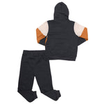 Outfit casual y moderno para bebé niño. La sudadera de felpa con bloques de color en marfil, mostaza y negro, y estampado frontal con número deportivo, se combina perfectamente con el pantalón negro de cintura elástica. Ideal para días frescos, paseos o reuniones informales con estilo.